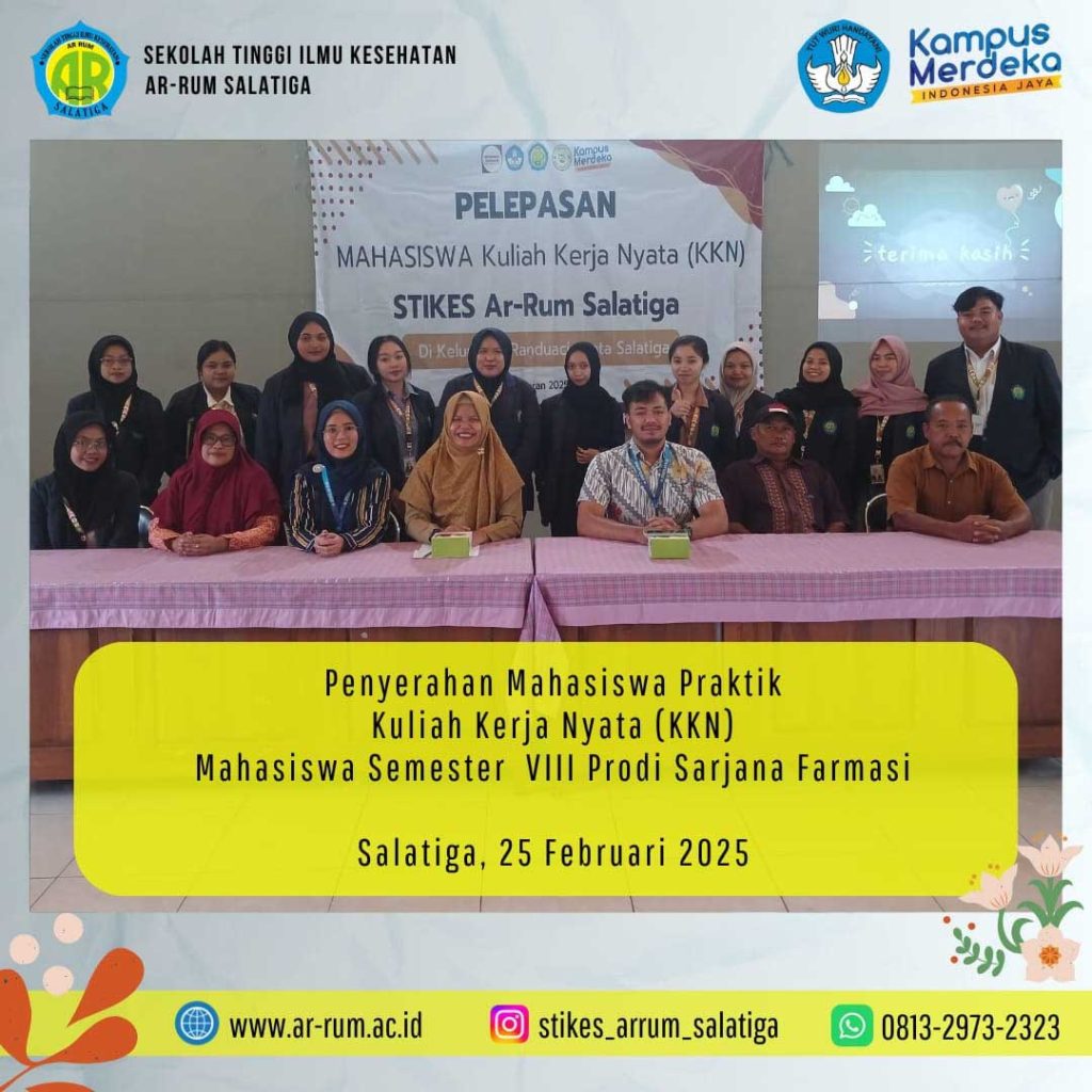Acara serah terima mahasiswa KKN ini berlangsung dengan penuh semangat dan dihadiri oleh berbagai pihak penting, di antaranya Ketua STIKES Ar-Rum, Ibu Retnaning Muji Lestari., S.ST., M.H, Lurah Randu Acir yaitu Ibu Dian Widhinafisa., S.STP., MM, Ketua RW, para kader PKK, serta dosen pembimbing dari Program Studi Farmasi. Kehadiran mereka menandakan dukungan penuh terhadap kegiatan yang bertujuan meningkatkan kesejahteraan dan kesehatan masyarakat setempat.